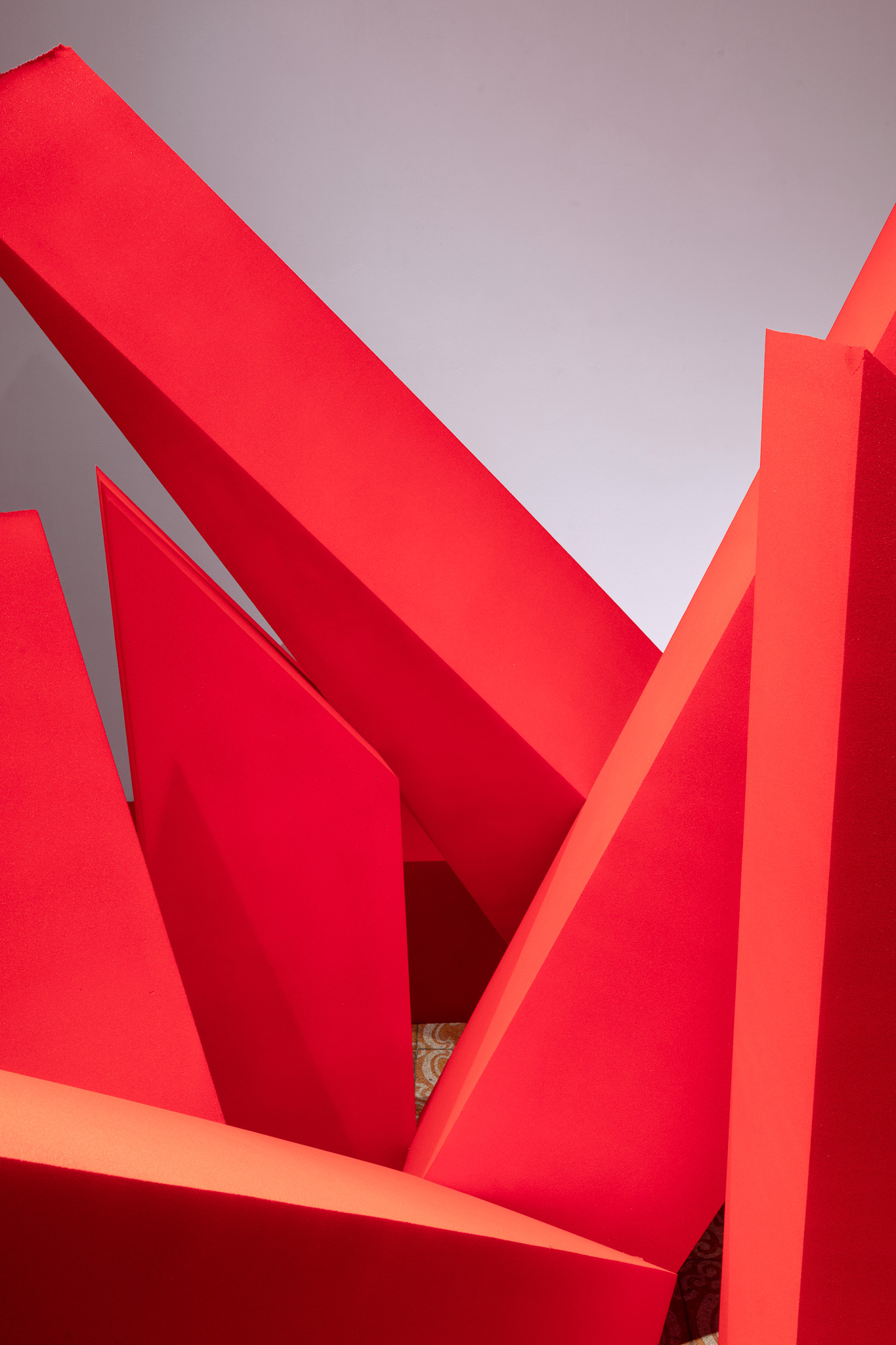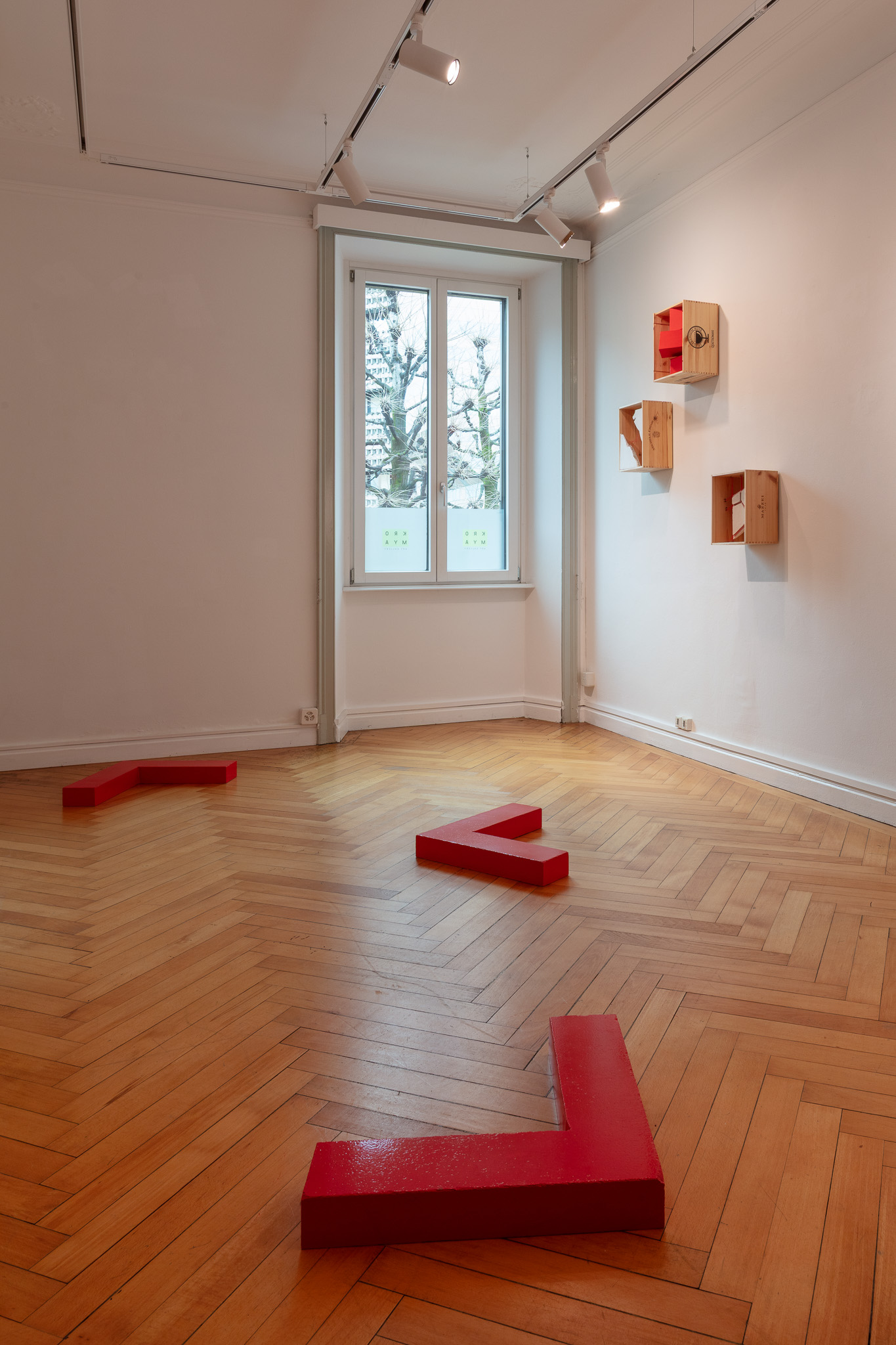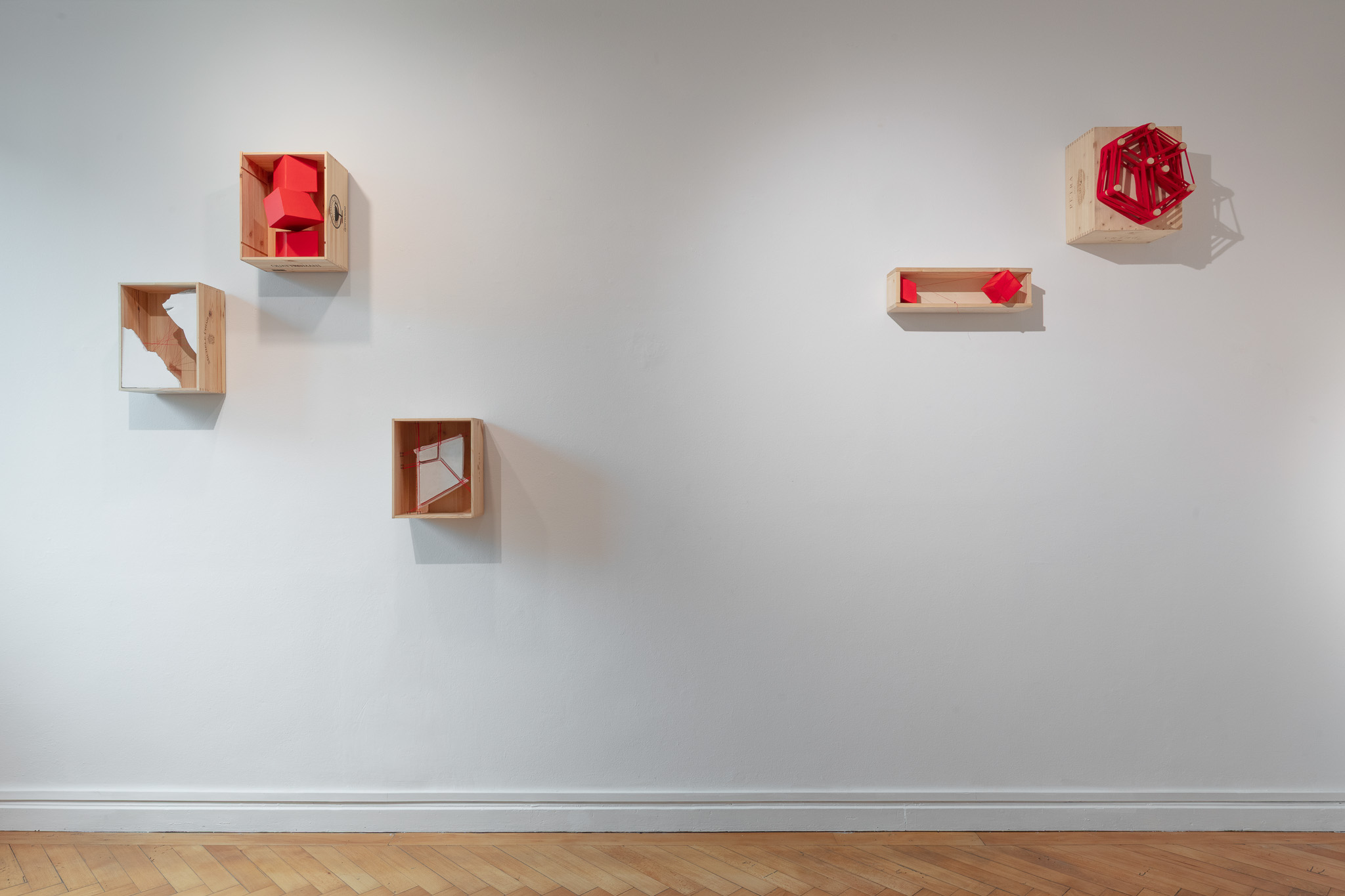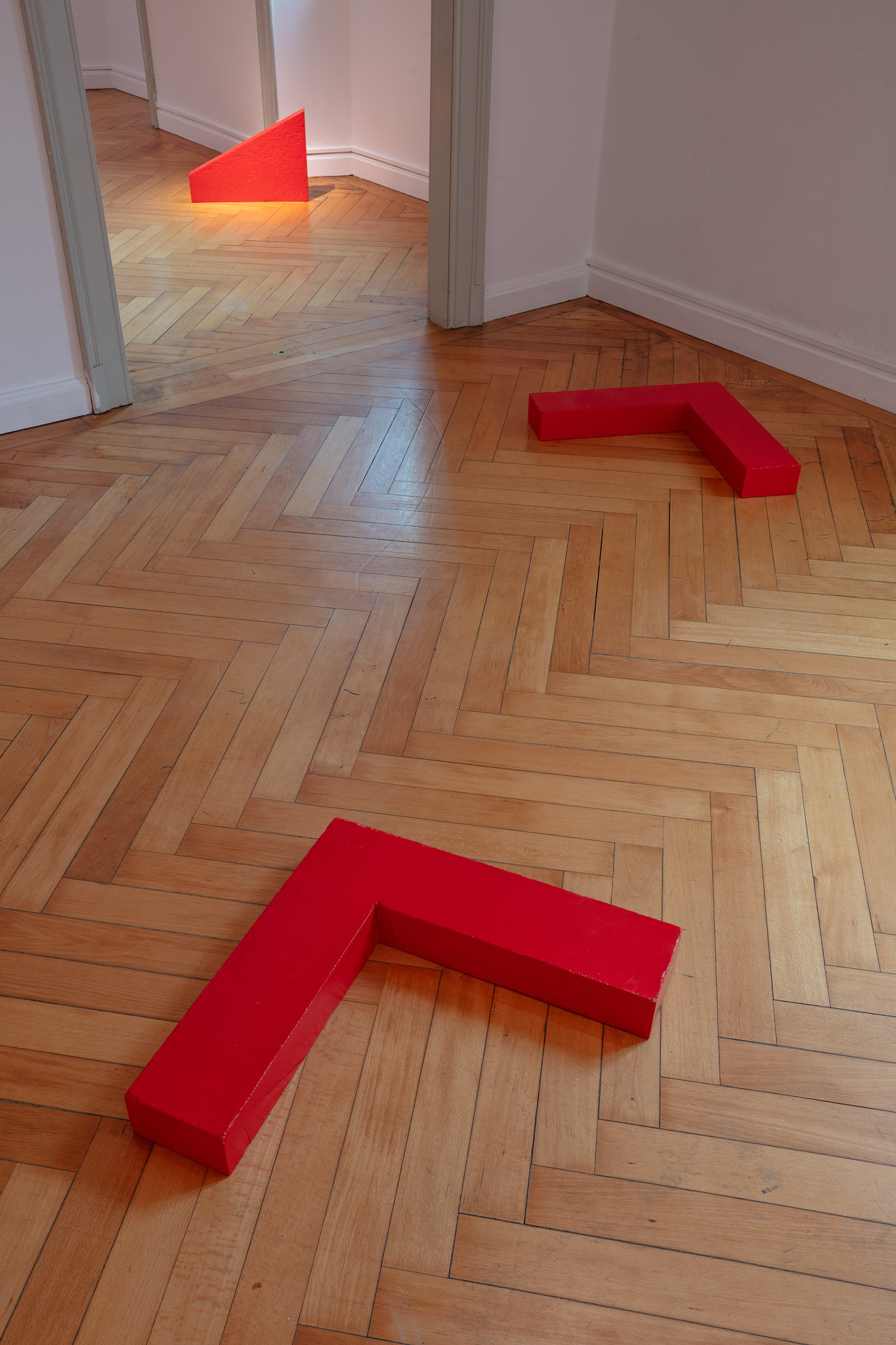 Elemento ricorrente dell’intero progetto è il colore rosso, che attraversa la mostra come una grammatica visiva comune. Il rosso diventa un segno di continuità capace di unificare materiali diversi — dalla pietra alla gommapiuma, dal plexiglas alla pittura — e di stabilire un equilibrio formale tra le opere.